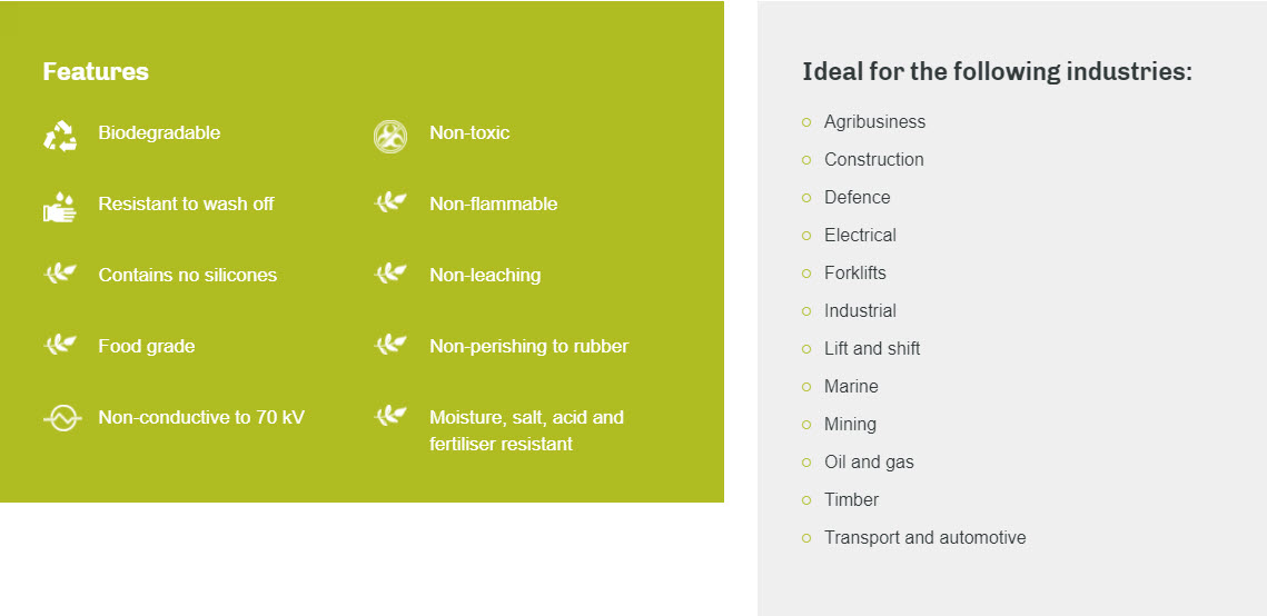 - Lubricates rubber hoses, o-rings, linkages, pivot pins and bushes